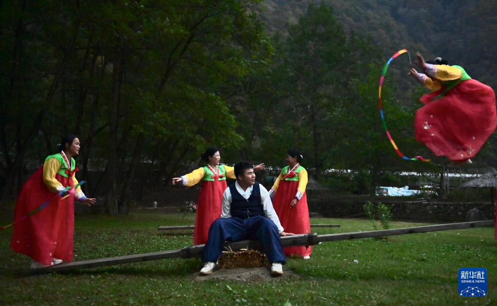 10月12日,朝鲜族村民在辽宁省丹东市的三道河朝鲜族民俗村为游客表演跳跷跷板。