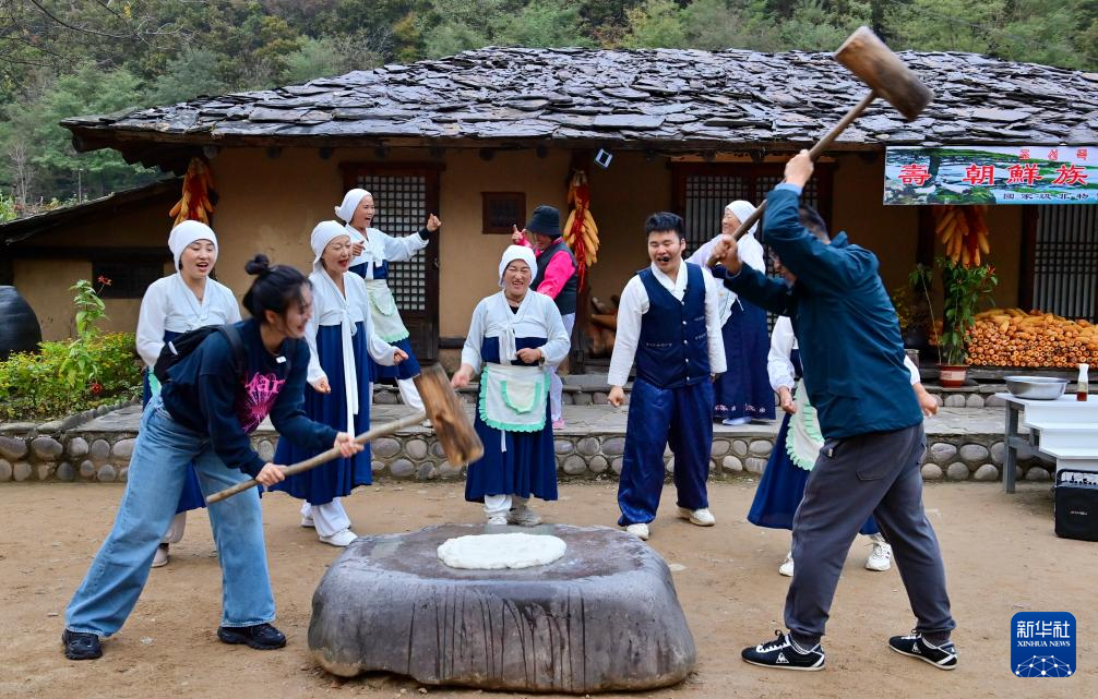 10月12日,游客(前)在辽宁省丹东市的三道河朝鲜族民俗村体验制作打糕。