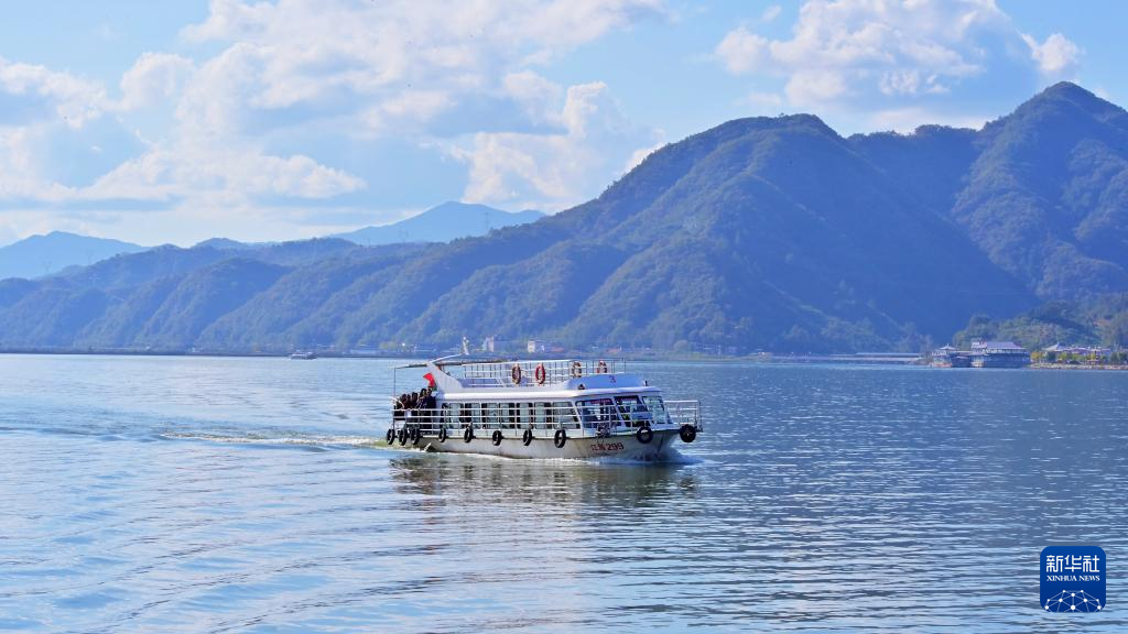 10月13日,游客在G331辽宁丹东段沿线的宽甸河口景区乘坐游船游览鸭绿江。