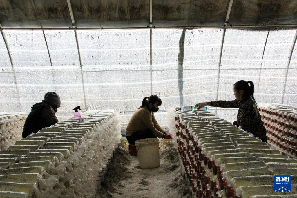 11月4日,在吉林省白山市长白朝鲜族自治县马鹿沟镇南尖头村白灵菇种植基地,农户在培育菌包。
