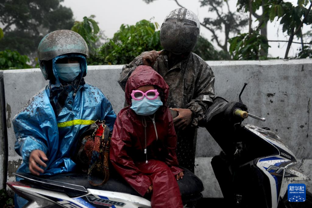 11月21日,在印度尼西亚东爪哇省,人们穿着雨衣冒着火山灰出行。