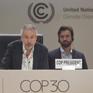 11月21日,在巴西贝伦举行的《联合国气候变化框架公约》第三十次缔约方大会(COP30)上,大会主席多拉戈发言。