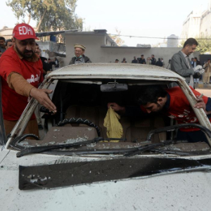 11月24日,在巴基斯坦西北部开伯尔-普什图省首府白沙瓦,安全人员在爆炸袭击现场查看。