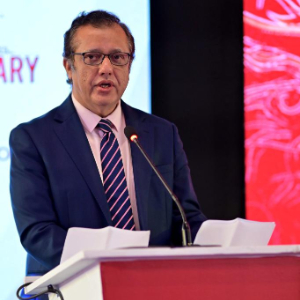 11月25日,在巴基斯坦南部城市卡拉奇,巴基斯坦国家银行(央行)执行董事穆罕默德·马利克在巴基斯坦人民币清算行(中国工商银行卡拉奇分行)举办的“人民币国际化在巴十周年”活动上致辞。