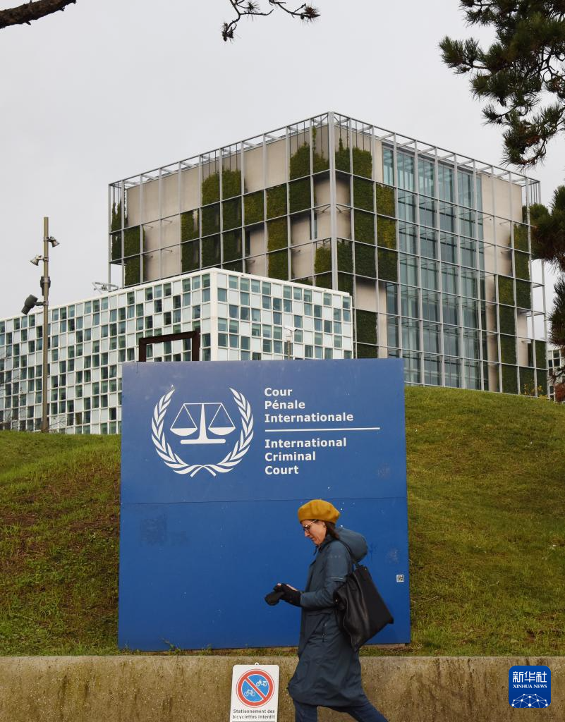 11月28日,在荷兰海牙,行人从国际刑事法院的标牌前走过。