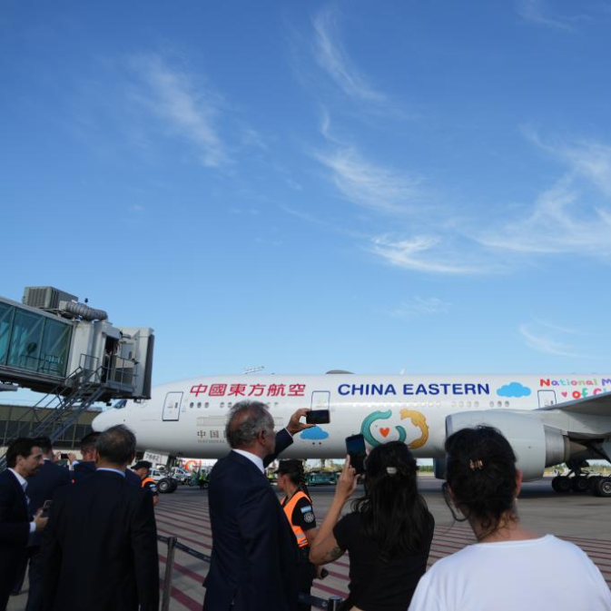 12月4日,阿根廷首都布宜诺斯艾利斯埃塞萨国际机场的工作人员欢迎中国东方航空公司执行MU745航班抵达。