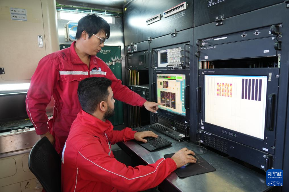 11月27日,中海油服技术人员在维保车间查看“璇玥”测井设备状况。