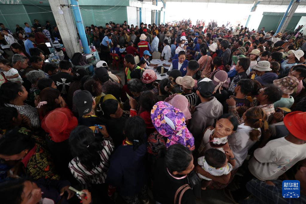 12月12日,在柬埔寨班迭棉吉省的一处居民安置点,因柬泰边境冲突而撤离的柬埔寨民众排队领取物资。