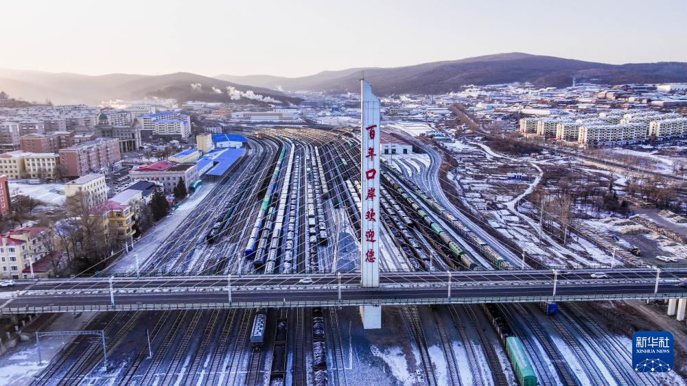 回程中欧班列停靠在绥芬河站南场(12月26日摄,无人机照片)。