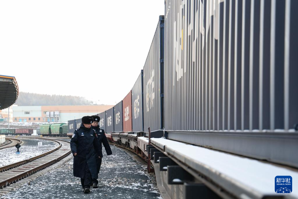 12月25日,移民管理警察在绥芬河站南场进行中欧班列车体检查。