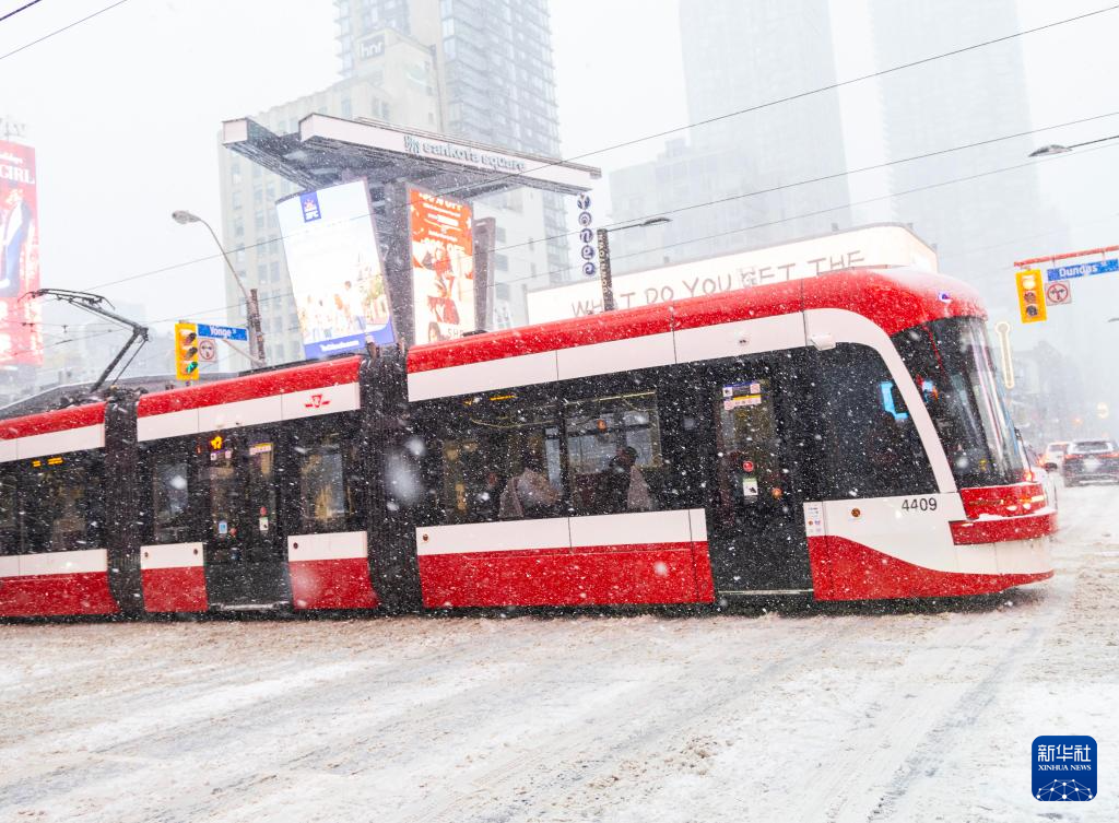 12月26日,在加拿大多伦多,一辆有轨电车在风雪中行驶。
