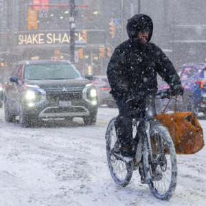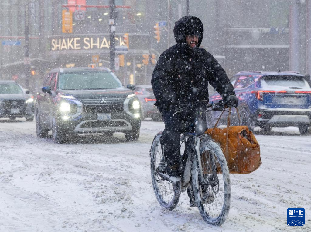 12月26日,在加拿大多伦多,一名男子在风雪中骑电单车出行。