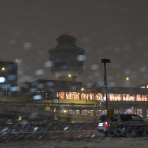 这是12月26日在美国纽约拍摄的雪中的拉瓜迪亚机场塔台。