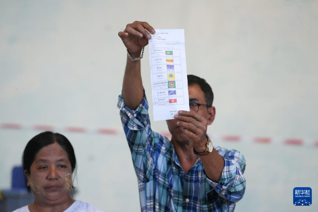12月28日,一名缅甸联邦选举委员会工作人员在位于仰光的投票站展示选票。