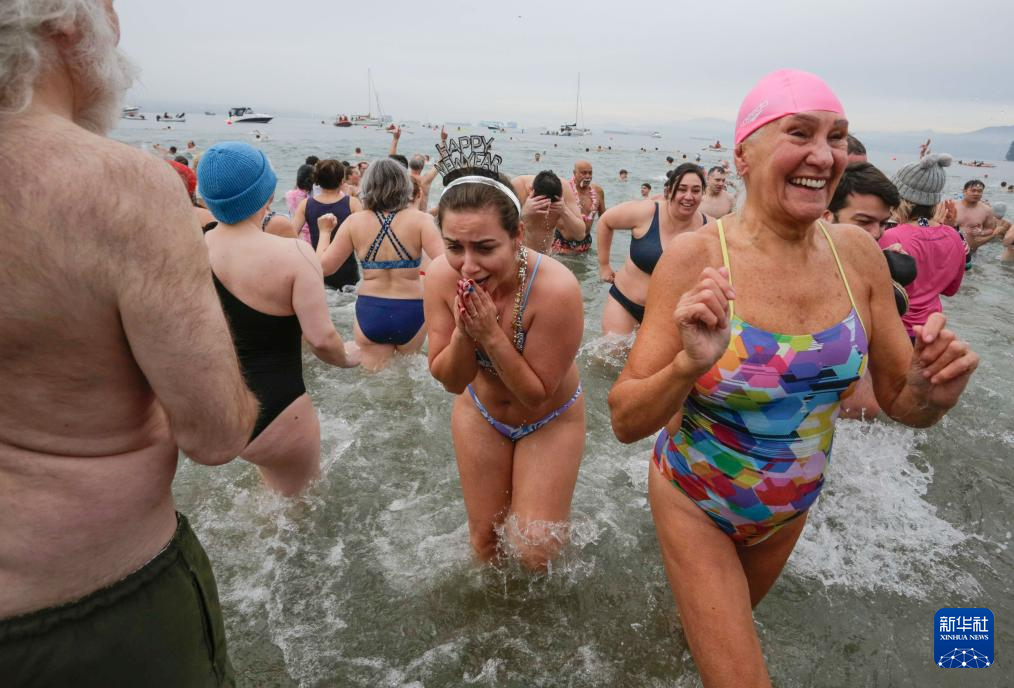1月1日,人们在加拿大温哥华参加“北极熊冬泳”活动,迎接新一年到来。