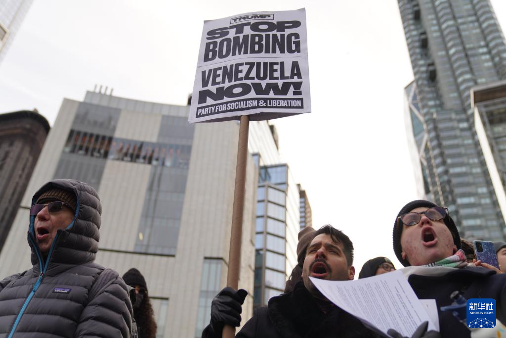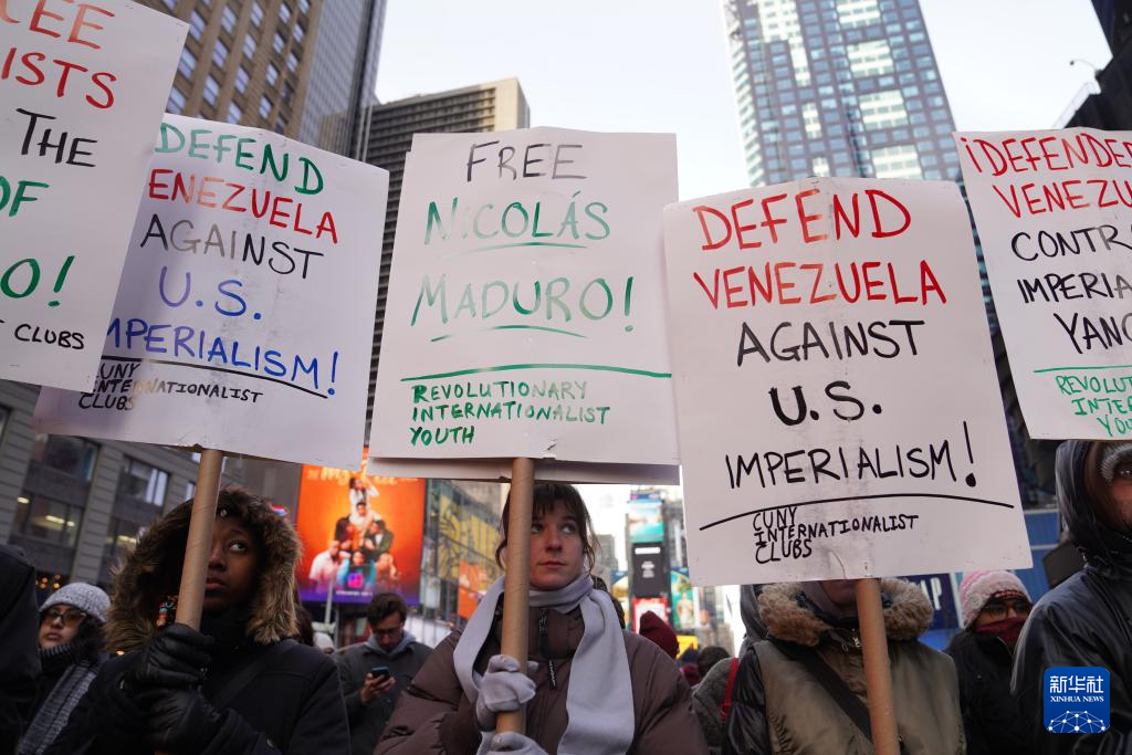 当日,近千名民众在美国纽约举行集会游行,抗议美国对委内瑞拉实施军事打击。