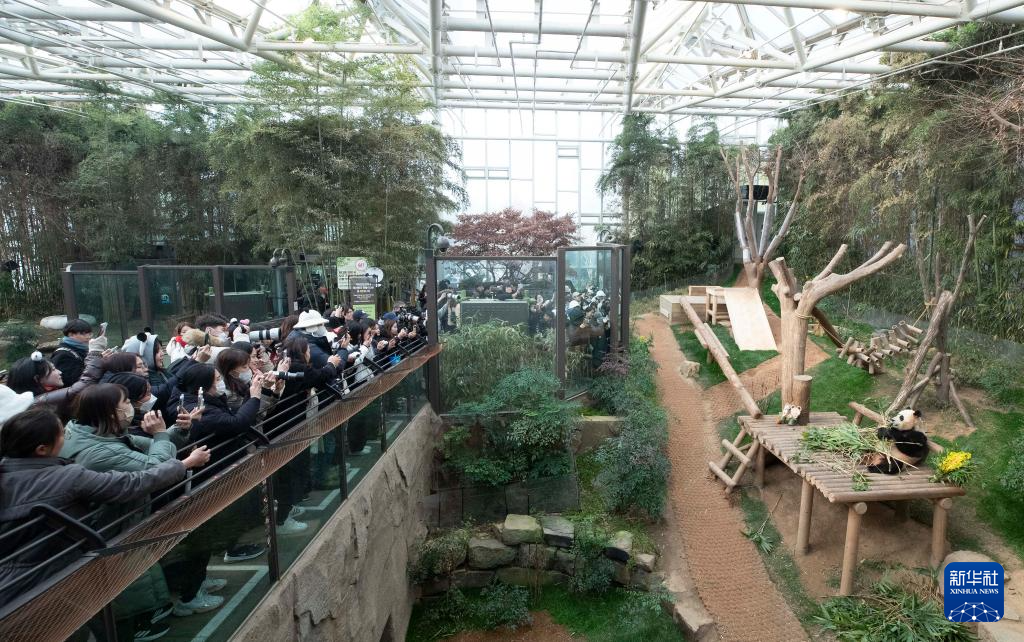 2024年3月3日,韩国民众在龙仁市的爱宝乐园观看大熊猫“福宝”。