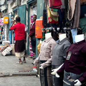 1月6日,在也门哈德拉毛省穆卡拉市,人们在街上购物。