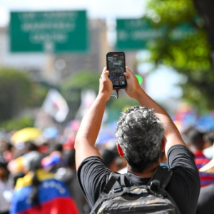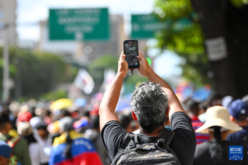 1月8日,一名男子在委内瑞拉首都加拉加斯拍摄青年大游行。