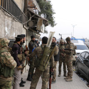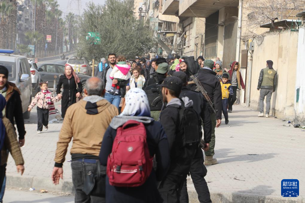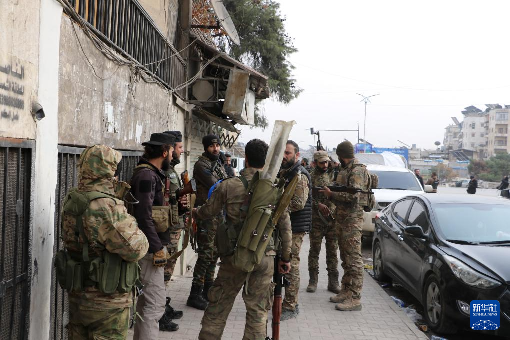 1月8日,在叙利亚阿勒颇市,叙过渡政府士兵在交流。