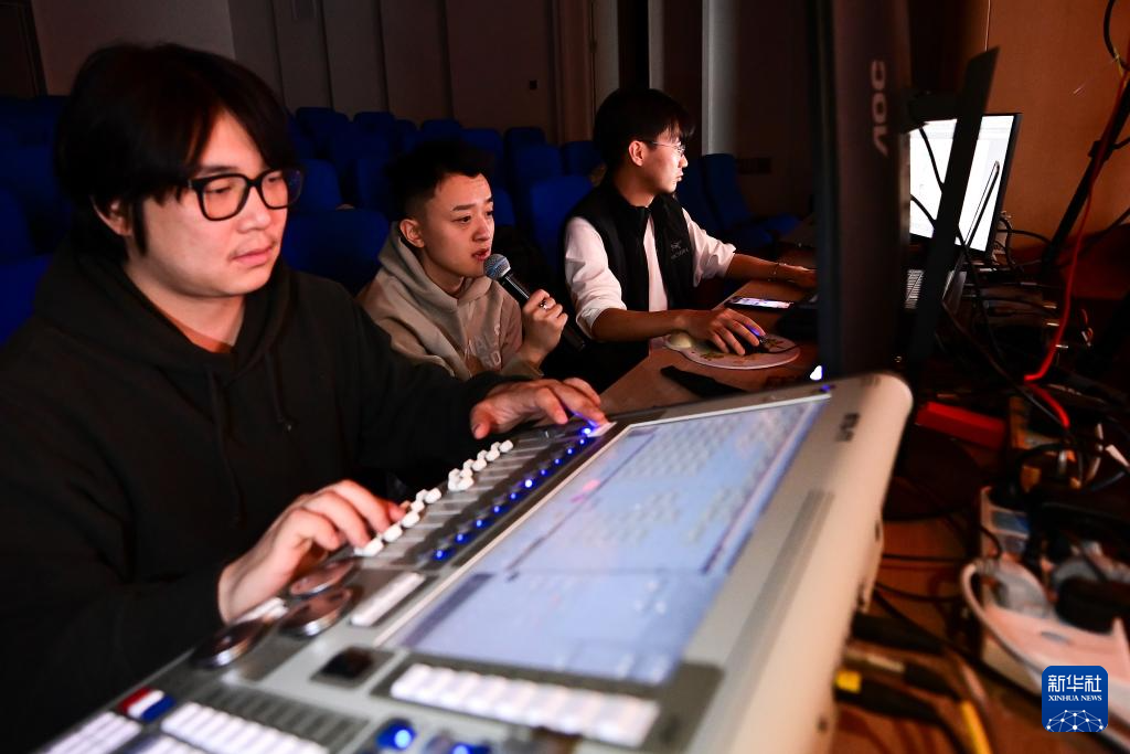 陕西省歌舞剧院“团播”团队的工作人员在直播间调试灯光、与网友互动(1月15日摄)。