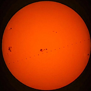 1月16日,在北京丰台花园拍摄的中国空间站飞过太阳的过程(堆栈合成照片)。