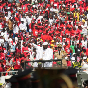 1月17日,在几内亚首都科纳克里,当选总统马马迪·敦布亚(中左)在就职仪式上向人们挥手致意。