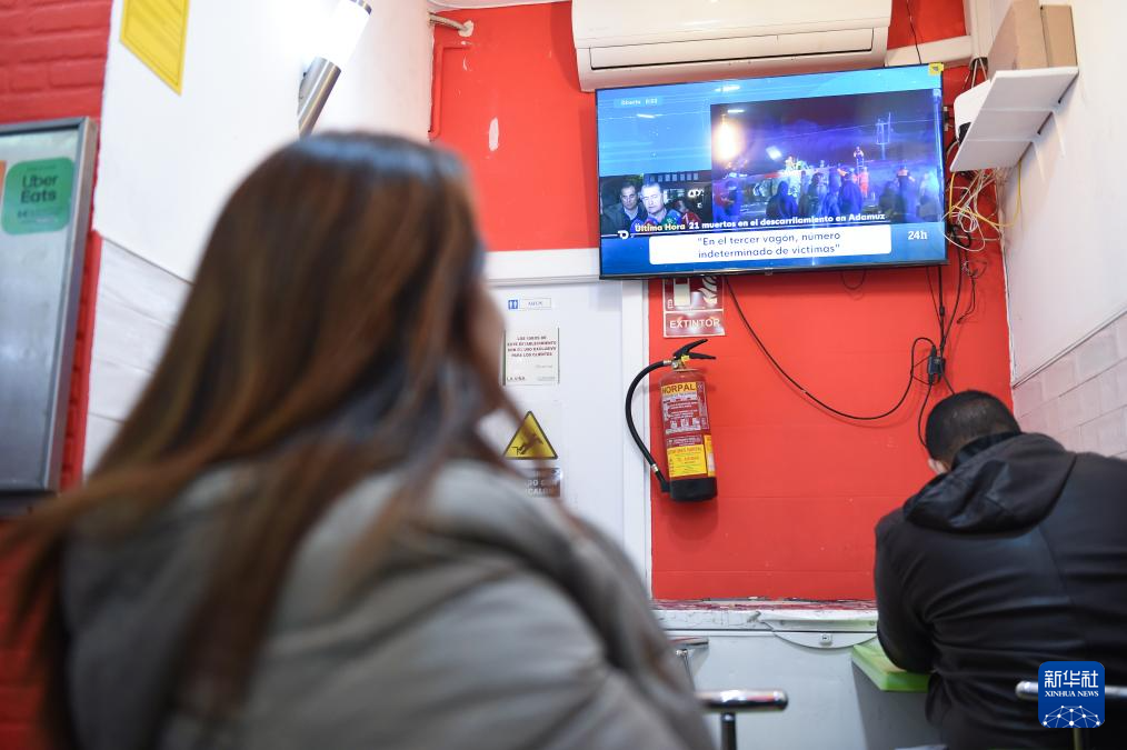 1月19日,人们在西班牙马德里一家餐厅内观看高铁脱轨相关新闻。