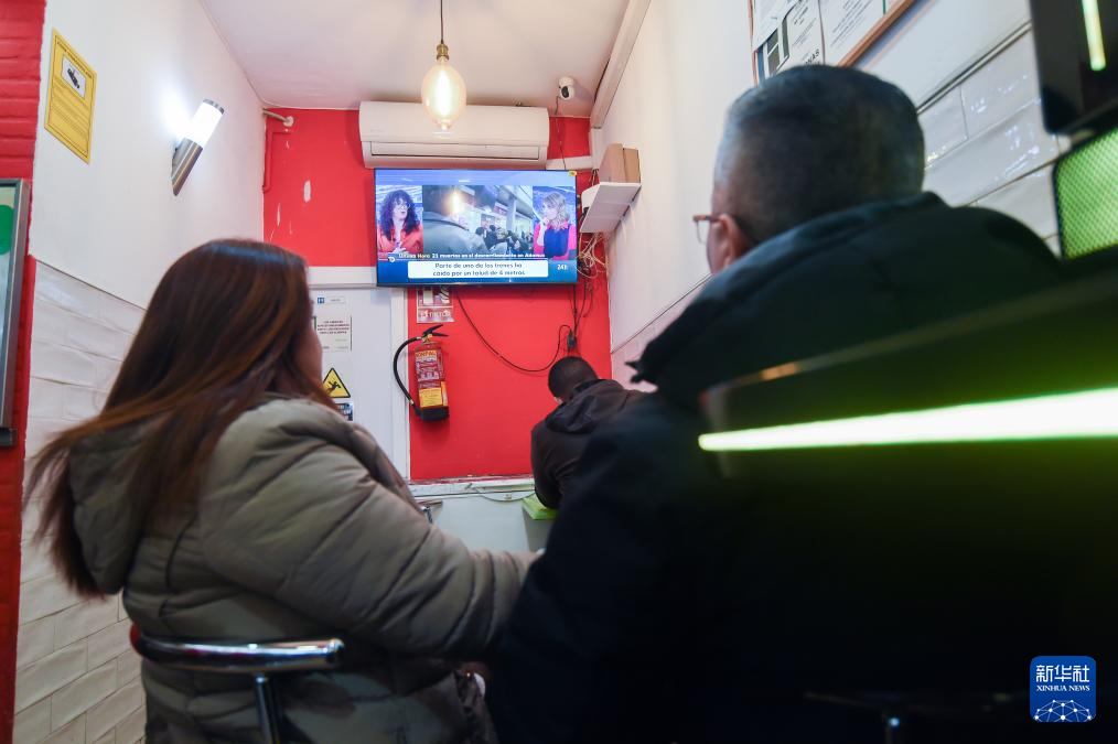 1月19日,人们在西班牙马德里一家餐厅内观看高速列车脱轨相撞事故相关新闻。