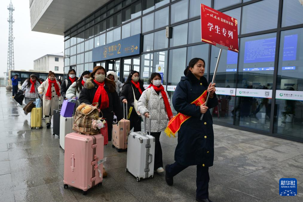 1月19日,乘坐团体包车的大学生在安徽阜阳西站进站乘车。