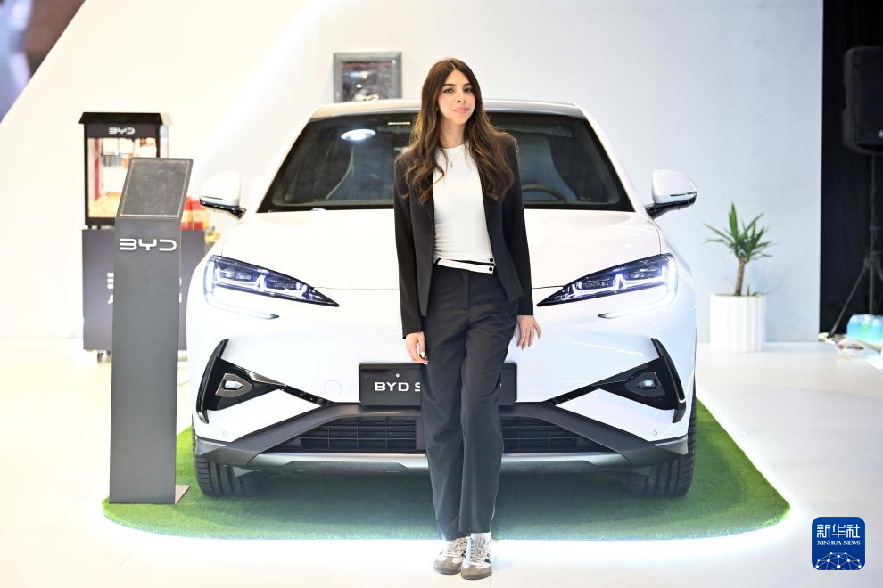 1月19日,在科威特哈瓦利省,模特展示一款比亚迪汽车。