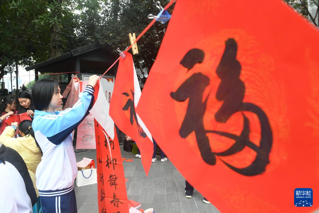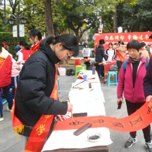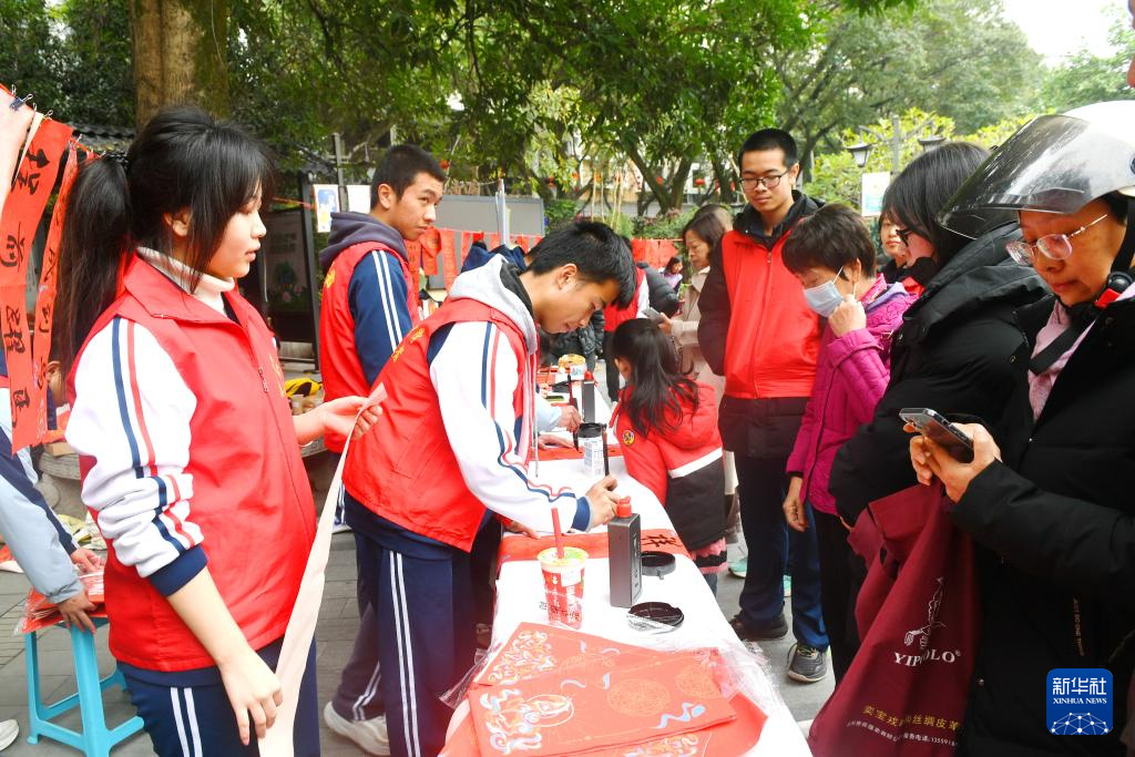 1月24日,在福州市西湖公园,福州第二中学学生为市民书写春联。