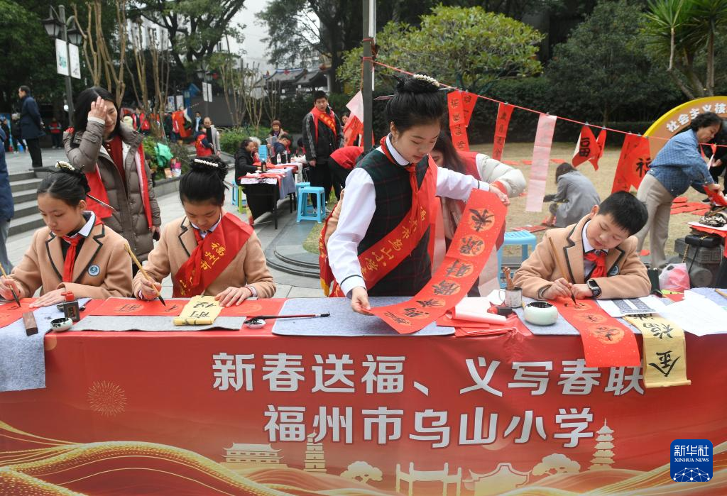1月24日,在福州市西湖公园,福州市乌山小学学生为市民书写春联。