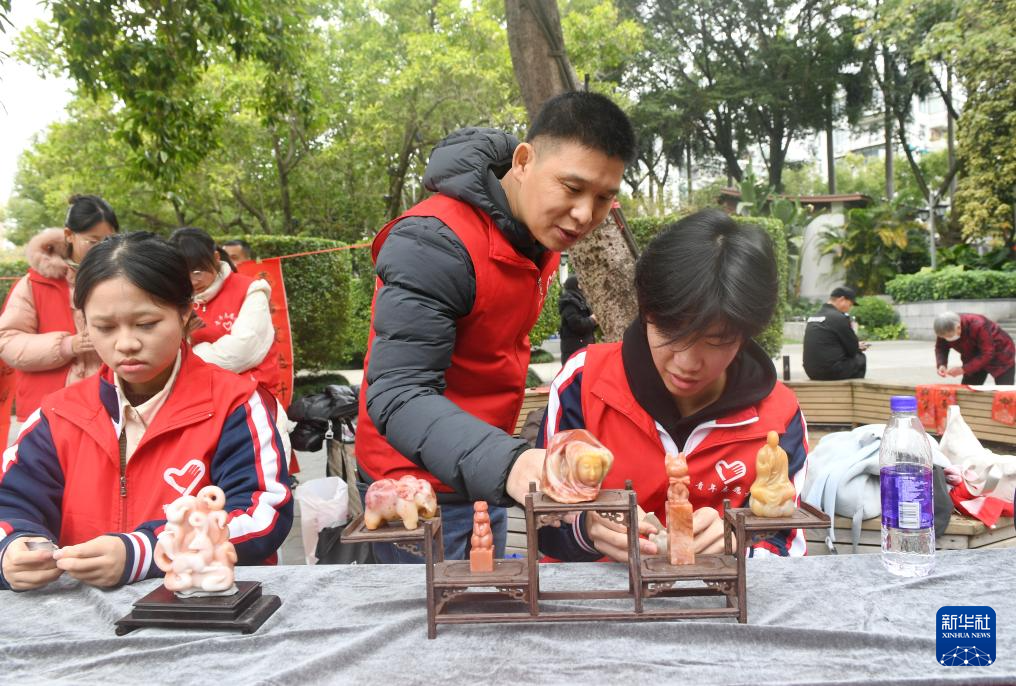 1月24日,在福州市西湖公园,福州旅游职业中专学校学生在雕刻寿山石。