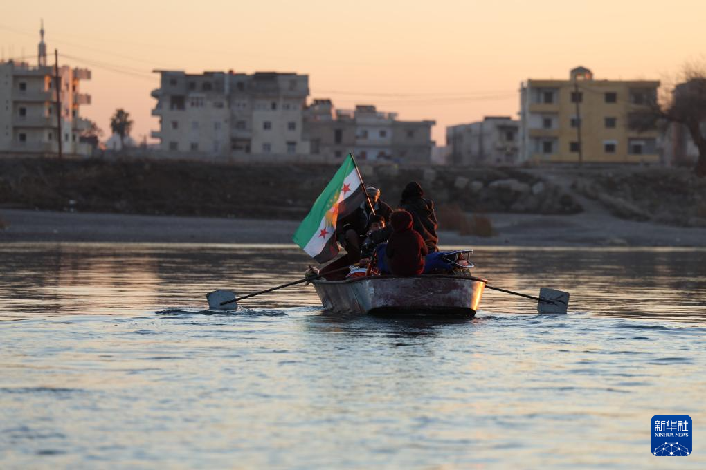 1月20日,在叙利亚东部拉卡省首府拉卡市,人们在桥梁被毁后乘船横渡幼发拉底河。