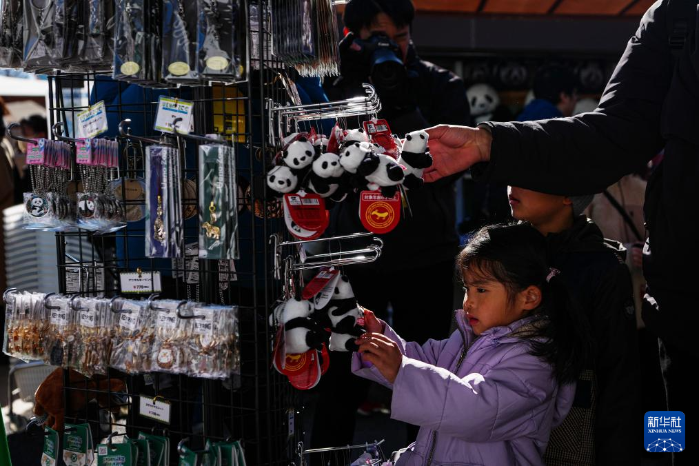 1月25日,游客在日本东京上野动物园挑选大熊猫纪念商品。