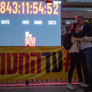1月27日,在以色列特拉维夫一处广场,人们参加计时牌关闭活动时拥抱。