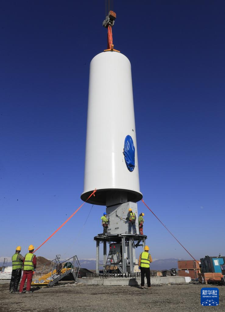 这是1月29日在格鲁吉亚什达-卡尔特里大区鲁伊西风电项目拍摄的正在吊装的风机。