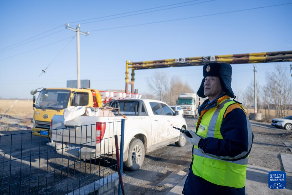 2月1日,工人张浩在道口指挥过往车辆通行。