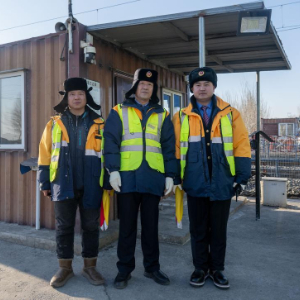 2月1日,通让线27公里道口工长徐中成(左二)与工人彭博(左一)、张浩在道口值班室前合影。