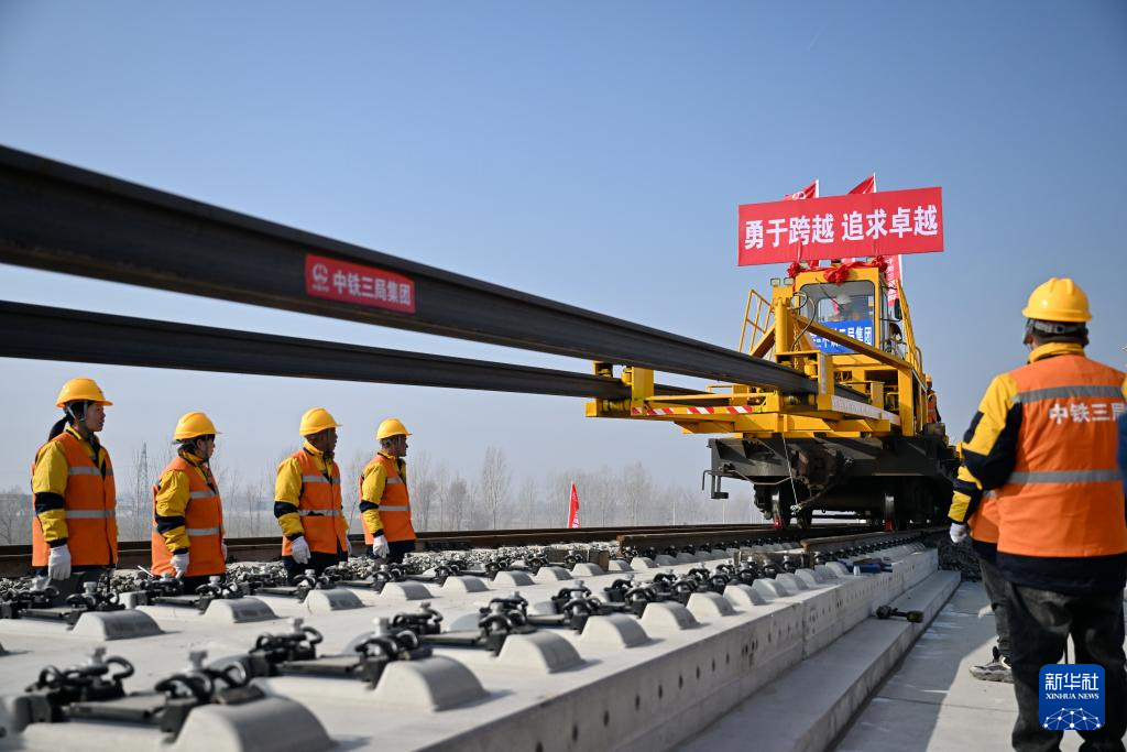 2月1日上午,在河北省保定市顺平县的雄忻高铁建设现场,中铁三局集团施工人员将首对500米长钢轨平稳、精准地铺设在无砟道床上,标志着雄忻高铁正式进入铺轨施工阶段。
