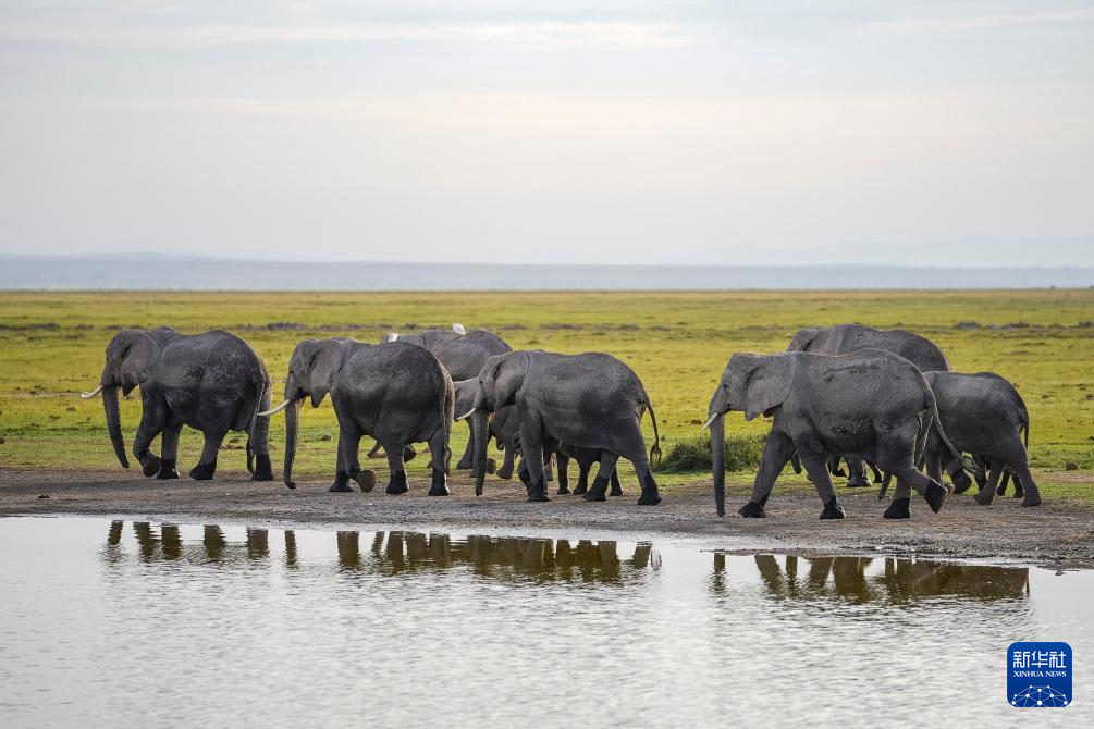 1月8日,在肯尼亚卡贾多郡,非洲象群走过安博塞利湖湖畔。
