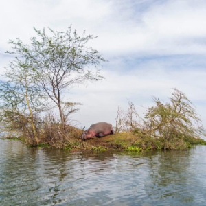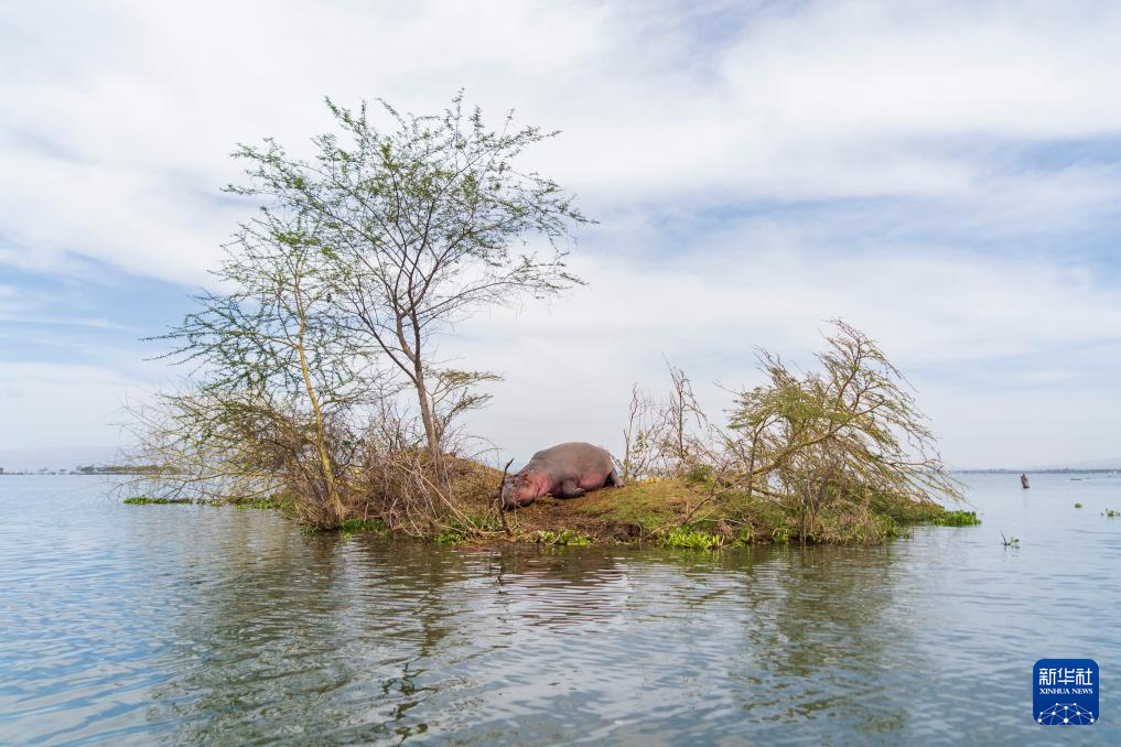2月1日,在肯尼亚纳库鲁郡,一只河马在奈瓦沙湖中一座小岛上休息。