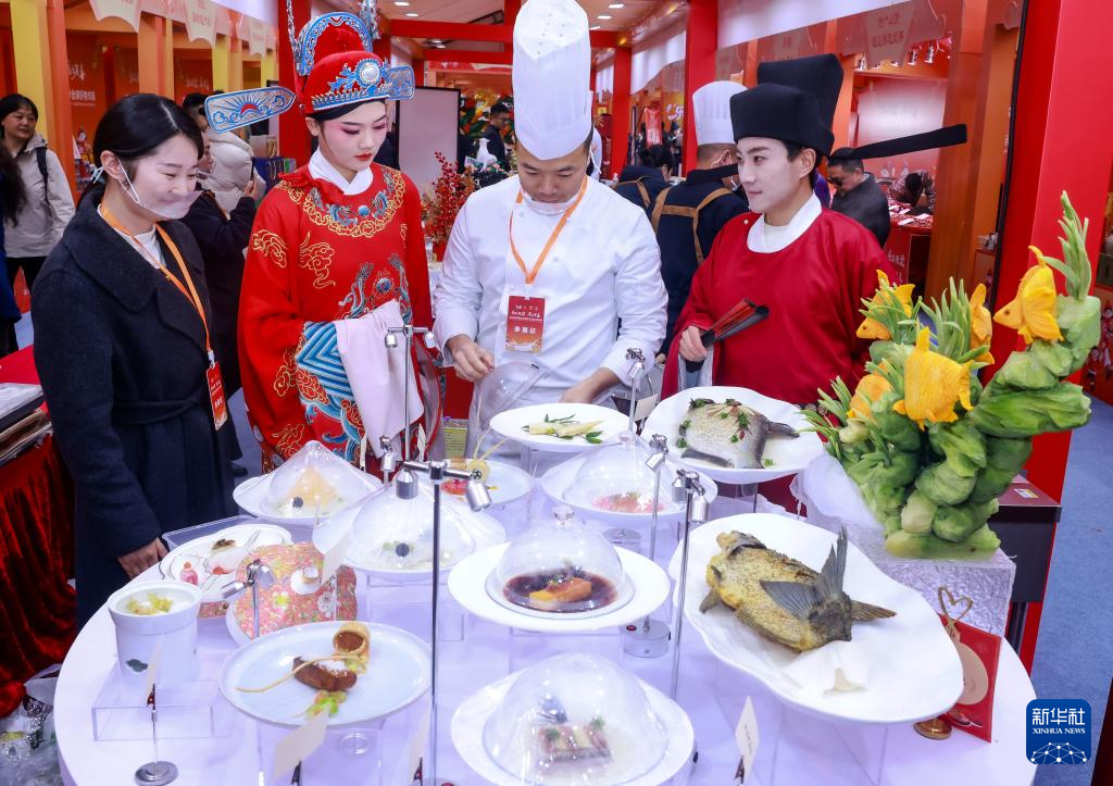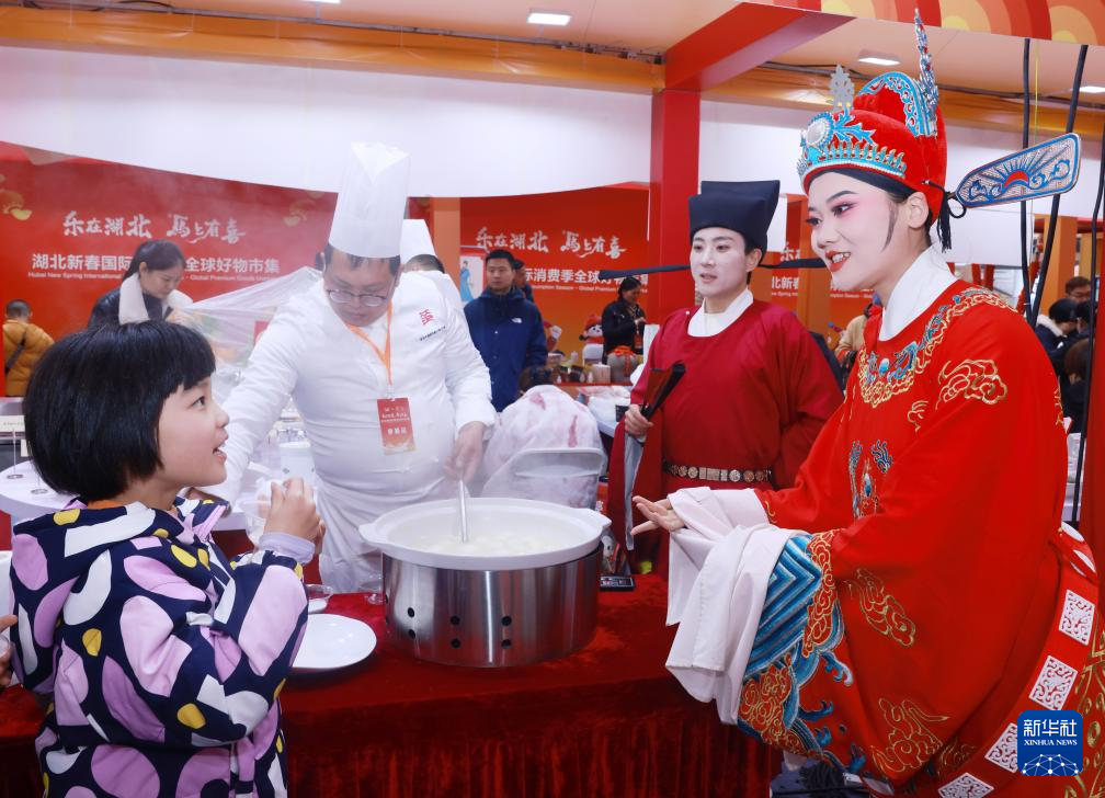 2月5日,在“湖北新春国际消费季”活动现场,黄梅戏演员推介地方特色美食。