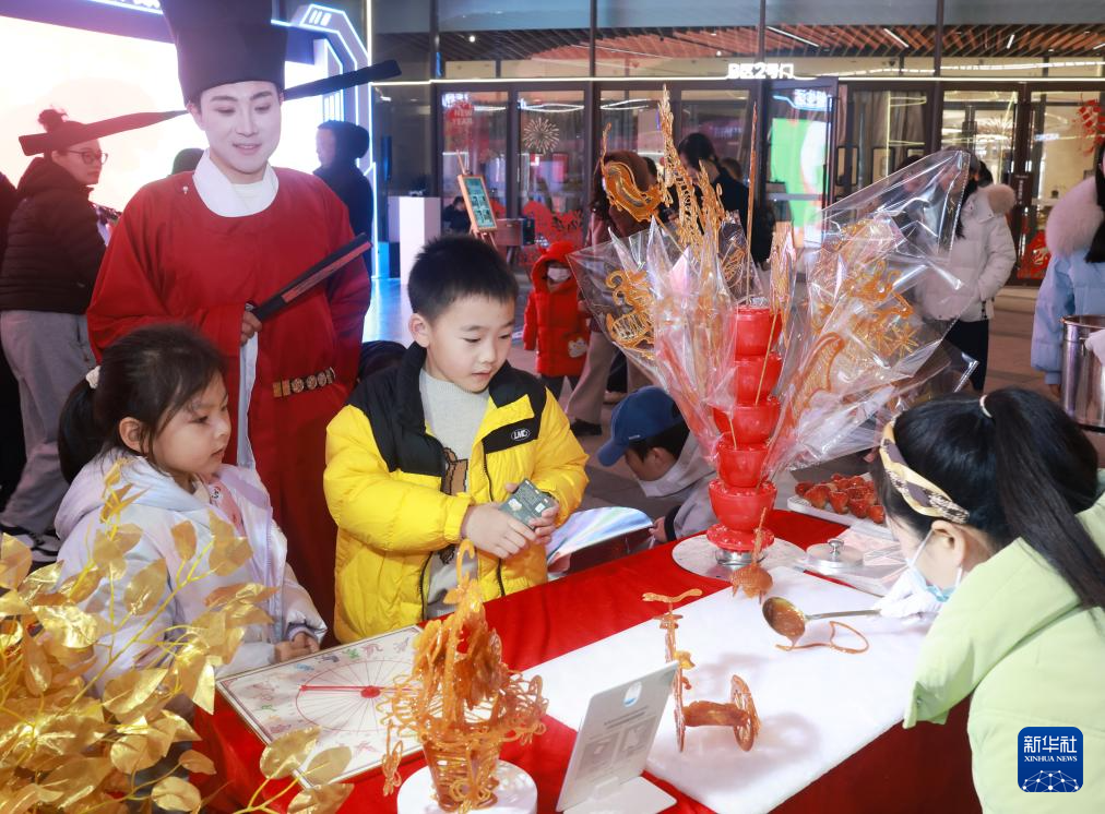 2月5日,小朋友在“湖北新春国际消费季”活动现场体验糖画制作。