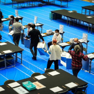 2月8日,在日本东京,工作人员在一处计票站内工作。