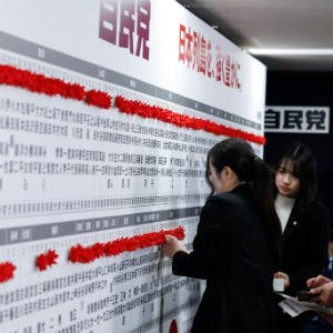 2月8日,在日本东京的自民党总部,工作人员将象征成功当选的红花贴在候选人名字上。
