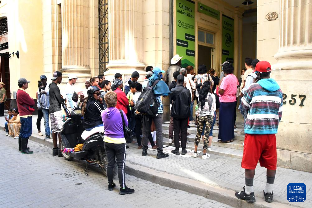 2月10日,在古巴首都哈瓦那,人们在一家银行入口等待办理业务。
