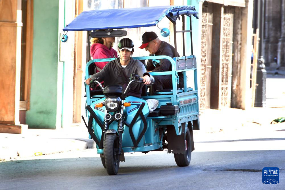 2月10日,在古巴首都哈瓦那,人们乘坐电动三轮车出行。