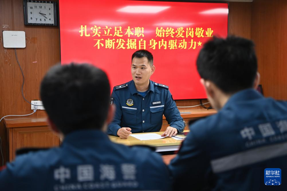 2月10日,中国海警万山舰执法员陈晨(中)在对舰员们开展每周的思想政治教育。